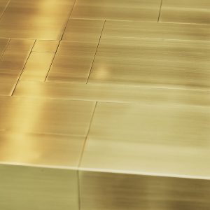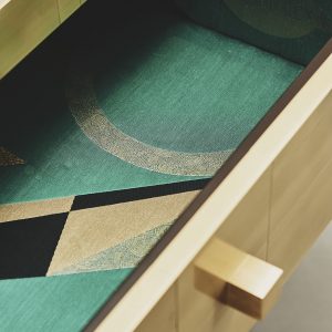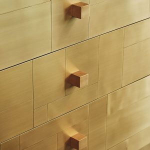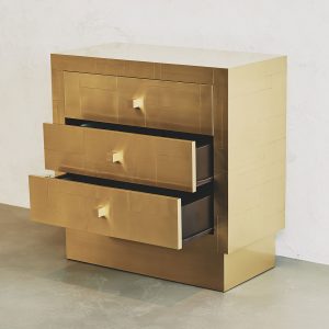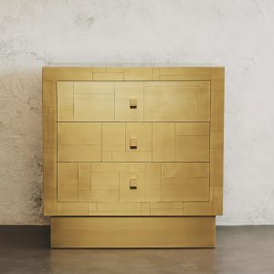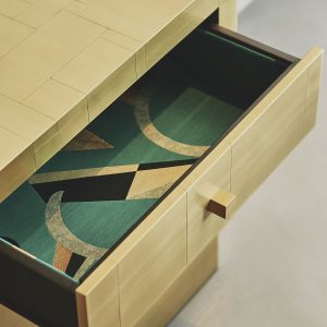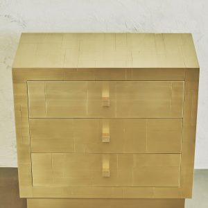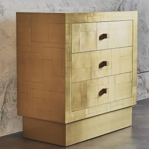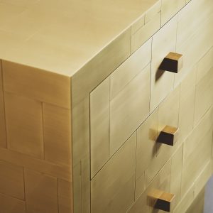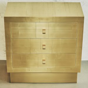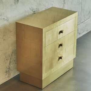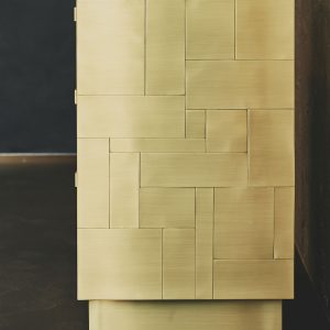 La sua essenza dalle linee semplici e dai volumi netti, è esaltata dal rivestimento in tessere di ottone che, come in un mosaico, si giustappongono con forme e disposizioni irregolari, inseguendo un equilibrio ponderato dalla finitura esterna satinata a mano. Al tatto la superficie risulta liscia e tratteggiata dalle scanalature tra le tessere. Alla vista, la lavorazione esterna crea un fascio di linee orizzontali riprese poi all’interno dei cassetti dal prezioso rivestimento in tessuto che spezza l’ordine delle linee pure esterna, con le sue geometrie inaspettate.
